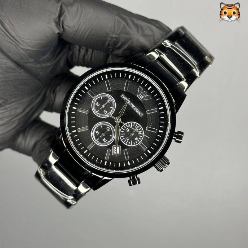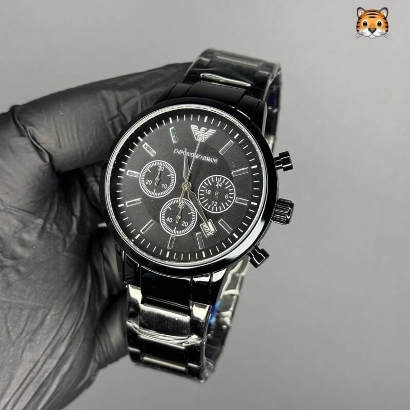- Feature – Working Chronograph with Original Japan Quartz Movement, Black Dial, Armani Logo on Key, Solid Stainless Steel Back, Original Locking Mechanism and Full Black Metal Chain