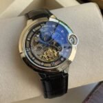 This exquisite Cartier timepiece blends luxurious craftsmanship with a mesmerizing skeleton dial, elegant Roman numerals, and a rich leather strap for timeless sophistication.