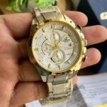 This Casio Edifice watch exudes elegance with its sleek design, intricate chronograph dials.