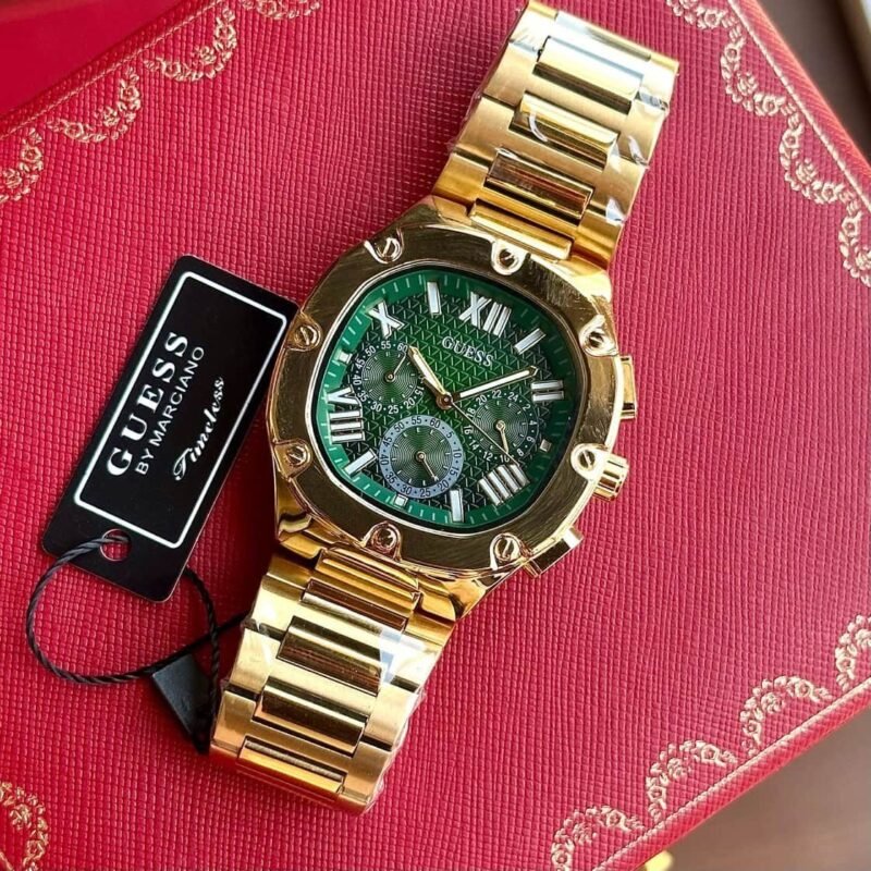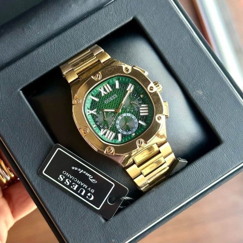The Guess Chronograph watch for men is the perfect timepiece for the man who loves to be on time. Featuring a Golden Tone Chain and a Green analog dial, this Chronograph watch will keep you looking sharp while also keeping you on schedule.