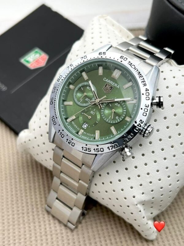 A sporty TAG Heuer Aquaracer equipped with a silver Case dial and green black blue figures dial Designed for men with urban, on-the-go lifestyles.